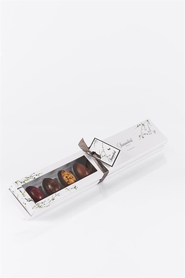 Æsken indeholder 9 forskellige varianter af vores raffinerede chokoladeæg i form af bl.a. marcipan af stenvalsede middelhavsmandler, praliné, karamel og orangeblomst.
