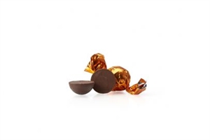Fyldte chokoladekugler med 70% chokolade m/chokocream indpakket i orange papir.