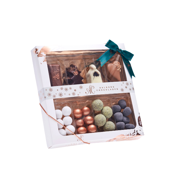 Denne dekorative æske med julemotiv indeholder nogle af julens absolutte klassikere med 4 smukke julefigurer lavet af marcipan og overtrukket med chokolade. Derudover er der 4 varianter af knasende jule dragée fra Aalborg Chokoladen.