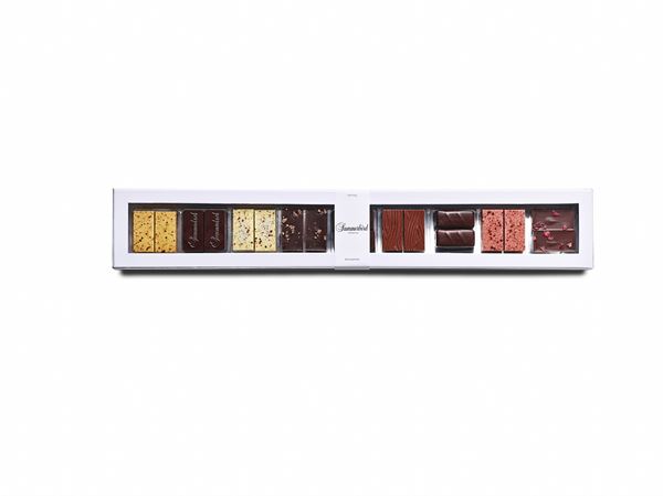 Smagsvarianterne er bl.a. nøddepraliné, mandelmasse, rålakrids, citron, hindbær-rosapeber, passionsfrugt, lime-karamel, nougat-havsalt, solbær ganache, og marcipan, så hele familien kan være med når chokoladen skal nydes.