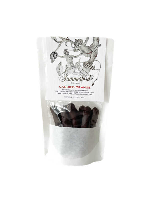 Lækker kandiseret appelsinskal fra solmodne økologiske spanske appelsiner overtrukket med tyk Guyas 71 % chokolade.